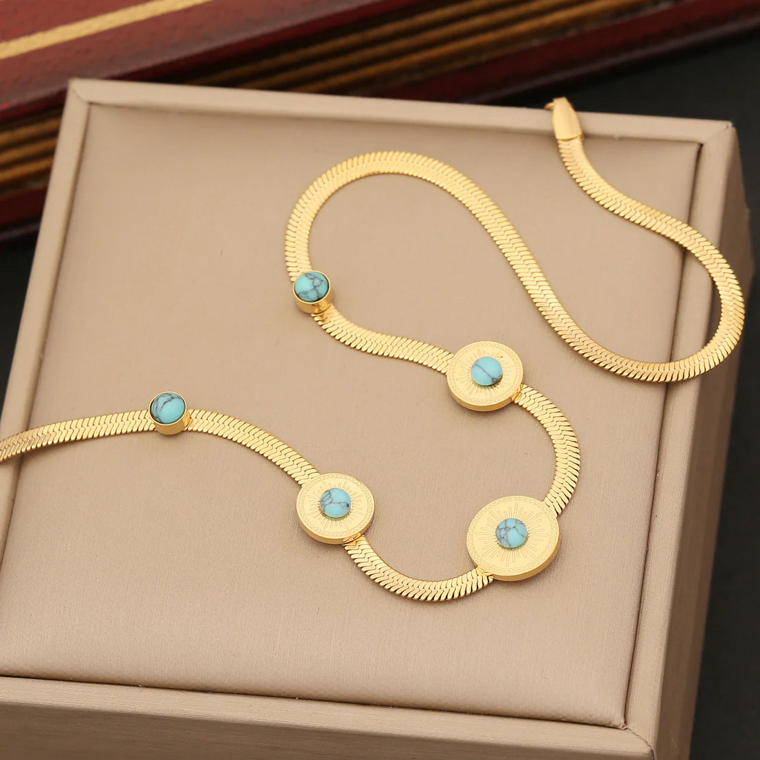 Elevate your style with our Aurora Radiance Necklace, a stunning blend of sophistication and charm. Crafted from high-quality stainless steel with a luxurious 18k gold-plated finish, this necklace features vibrant turquoise accents encased in radiant sunburst motifs.