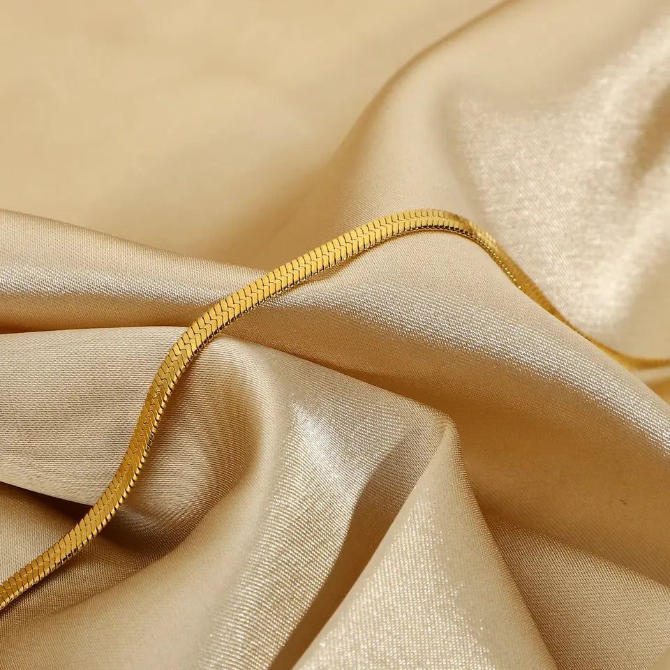 Design: Sleek flat snake chain with a smooth, fluid texture that drapes elegantly around the wrist